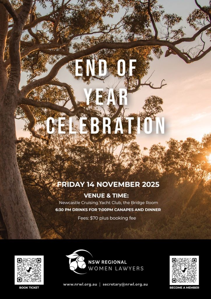 Tickets available here: https://events.humanitix.com/2025-nsw-regional-women-lawyers-end-of-year-celebration